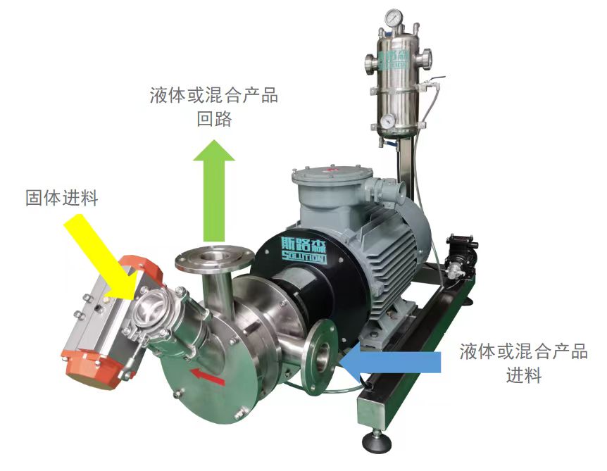 利用特殊转子的高速旋转产生真空,把粉料均匀的吸入工作腔中利用特殊转子的高速旋转产生真空,把粉料均匀的吸入工作腔中,并使其均匀的分布在快速流动的液流中,不产生大块团聚物: